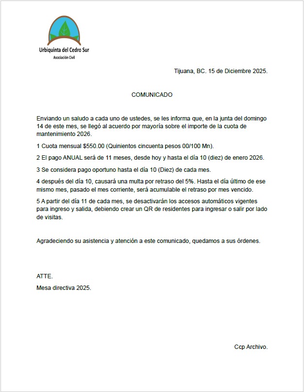 Comunicado: Cuota de Mantenimiento 2026
